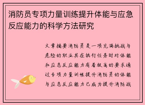 文章摘要:消防员是一项充满挑战与危险的职业,其在执行任务时对体能和应急反应能力有着极高的要求。通过专项力量训练提升消防员的体能与应急反应能力,已成为提升消防战斗力和安全性的关键。本文通过对消防员专项力量训练的相关研究进行深入分析,探讨如何通过科学的方法提升消防员在应急情况下的体能表现和反应速度。具体来说,文章从训练设计、力量训练方法、体能与技能整合训练、以及心理素质培养四个方面进行详细阐述。通过这些方法,旨在帮助消防员更好地适应高强度的应急任务,提高其执行效率和生还几率。最终,本文对消防员专项力量训练的重要性和未来发展趋势进行了总结与展望。